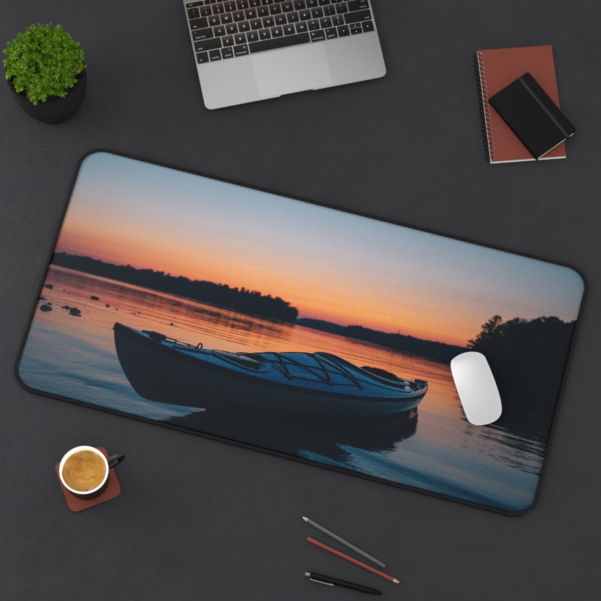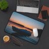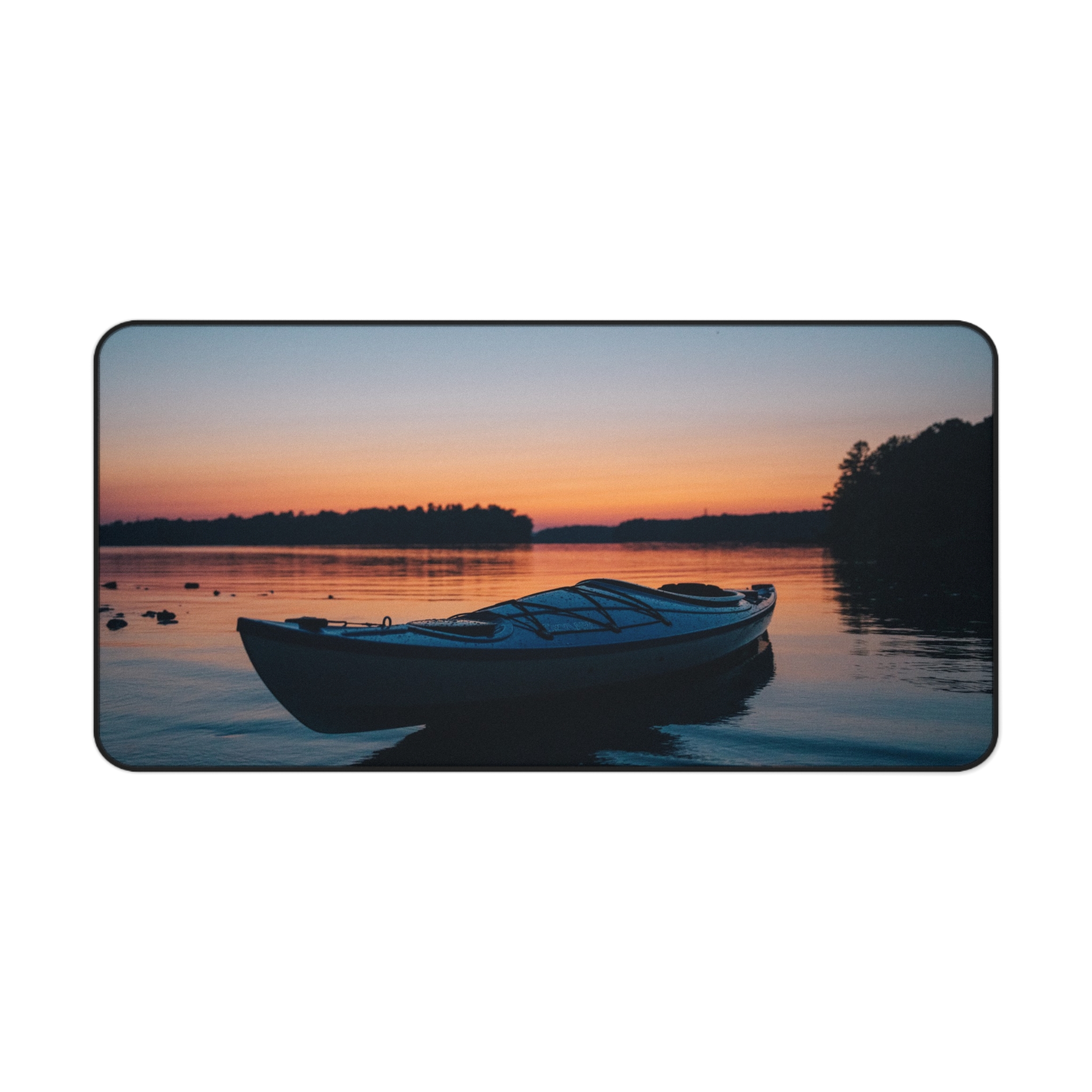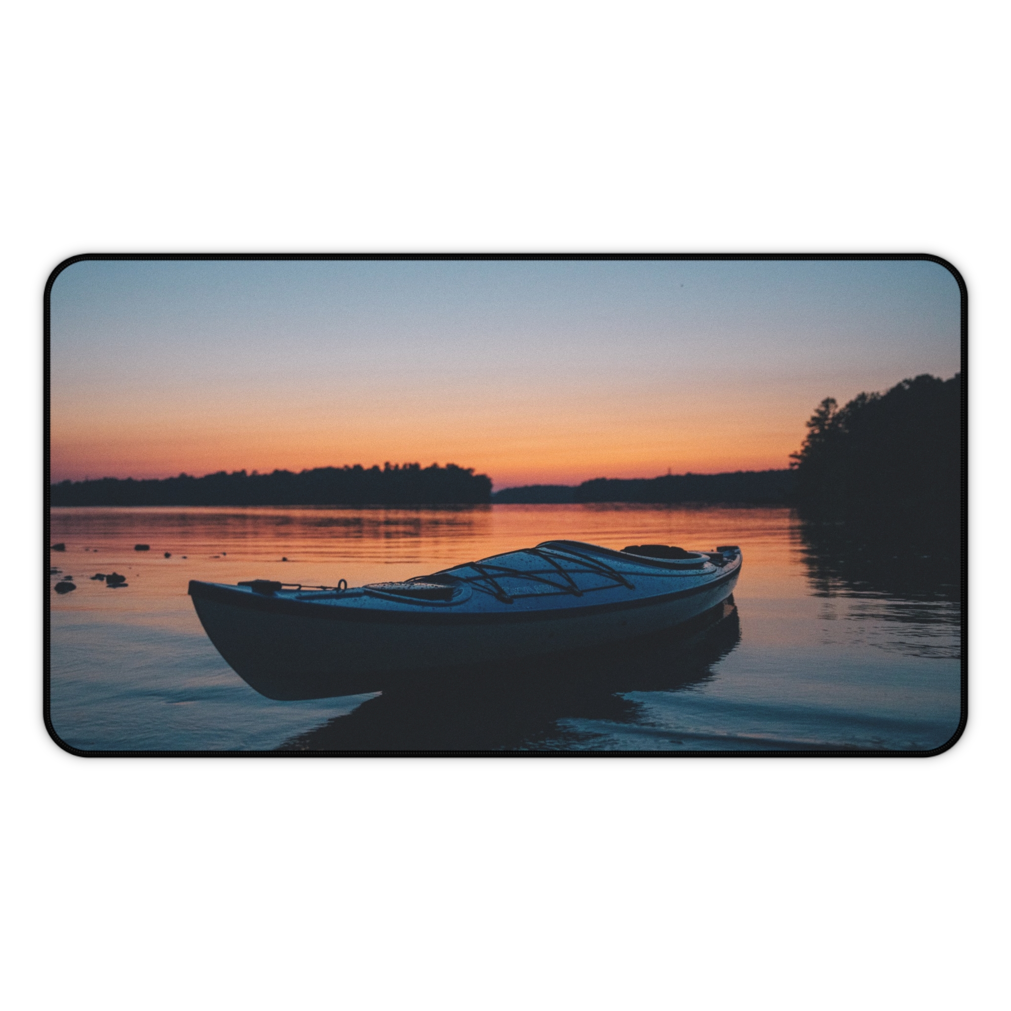 Bring the hush of a lakeside sunset to your workspace with this neoprene desk mat. A still boat rests against a sky that melts from soft coral into deepening blue — a quiet moment captured in vivid, crisp print. The smooth fabric gives your keyboard and mouse a steady glide, while the textured, anti-slip base keeps everything anchored during late-night projects or slow morning rituals. Hemmed edges add durability so the scene stays crisp through everyday use. Sized to fit a compact setup or spread across a full desk, it turns functional work into a calm, collected experience.