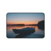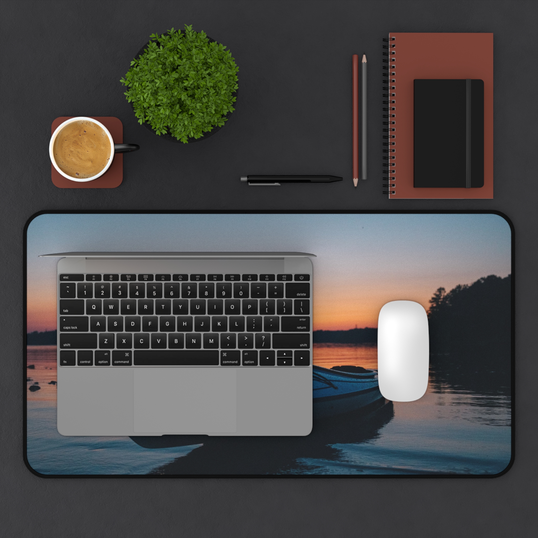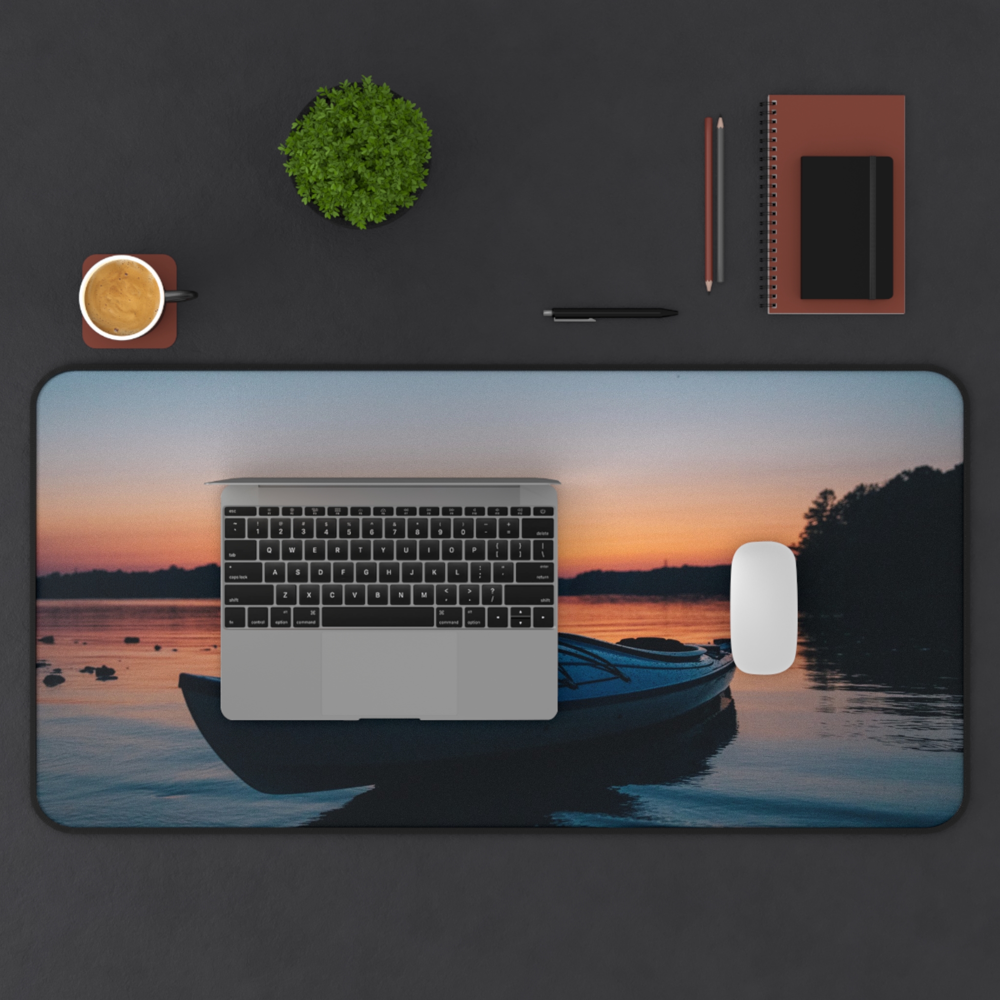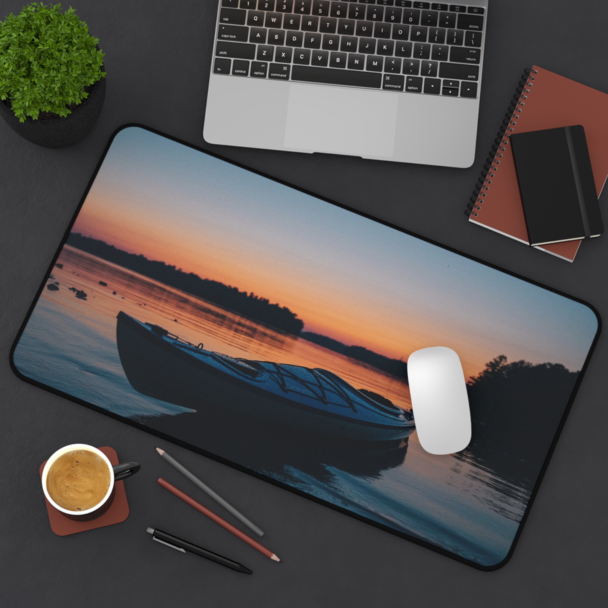 Bring the hush of a lakeside sunset to your workspace with this neoprene desk mat. A still boat rests against a sky that melts from soft coral into deepening blue — a quiet moment captured in vivid, crisp print. The smooth fabric gives your keyboard and mouse a steady glide, while the textured, anti-slip base keeps everything anchored during late-night projects or slow morning rituals. Hemmed edges add durability so the scene stays crisp through everyday use. Sized to fit a compact setup or spread across a full desk, it turns functional work into a calm, collected experience.